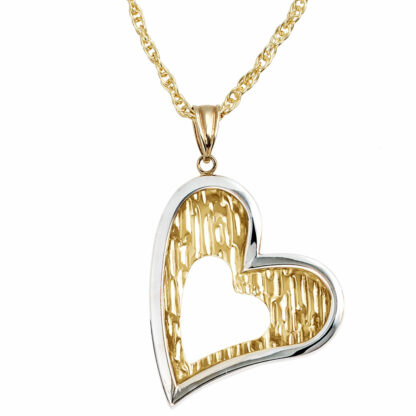 Attraktiv modern designter Anhänger mit Herz-Motiv aus 8k (333) Gelbgold. Der Herzanhänger ist umrahmt von einem rhodinierten 8k (333) Gold-Strang mit innenliegendem abstraktem 8k (333) Gelbgold Design und einem offenen Herzdekor. Ein auffallend schöner Blickfang. Maße: Gewicht ca. 1,5 g, Höhe ca. 26,6 mm, Breite ca. 27,4 mm, Tiefe ca. 1,9 mm. Lieferung erfolgt ohne Kette.