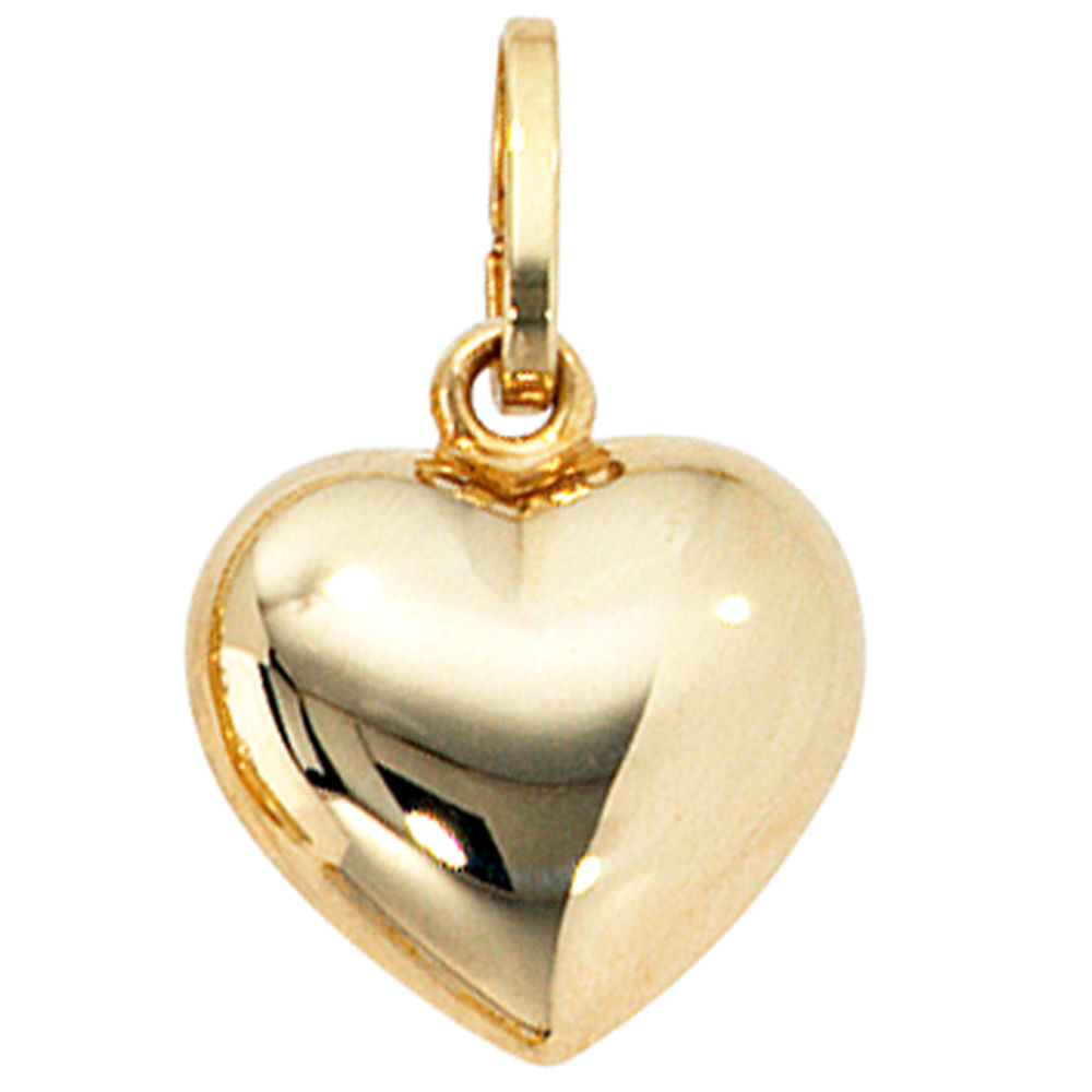 Eleganter Anhänger “Herz” aus poliertem 8k (333) Gelbgold. Maße: Gewicht ca. 0,3 g, Höhe ca. 11,6 mm, Breite ca. 10,5 mm, Tiefe ca. 3,9 mm. Lieferung erfolgt ohne Kette.