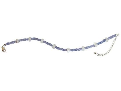 Eine seltene und elegante Kreation ist dieses Armband mit facettierten Tansaniten in Rondellform sowie facettierten Mondsteinen in weiß. Das Armband verfügt über ein Kettchen und Karabinerverschluss aus 925 Sterling Silber. Maße: Länge ca. 18 cm, Tansanit ca. 4 mm, Mondstein ca. 6 mm.