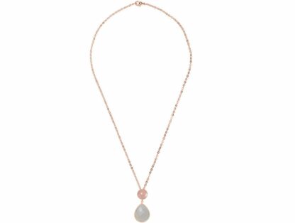 Edel designtes Collier aus rosévergoldetem 925 Sterling Silber mit einem Rosenquarz Cabochon und einem Tropfen facettierten Mondstein in grau. Das Collier verfügt über Karabinerverschluss. Maße: Länge ca. 45 cm, Anhänger ca. 5 cm, Breite ca. 2 cm.
