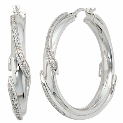 Elegante Creolen aus rhodiniertem 925  Sterling Silber mit facettierten Zirkonia in weiß verziert. Maße: Gewicht ca. 11,2 g, Durchmesser ca. 37,3 mm, Breite ca. 7,3 mm.