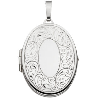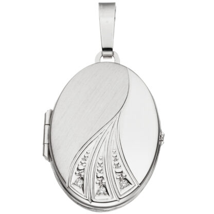 Klassisch geschwungen designtes Medaillon für bis zu 2 Fotos aus teilmattiertem 14k (585) Weißgold, besetzt mit 3 facettierten Brillanten, 0,03 ct., W/SI wesselton (weiß), SI=(kleine, mit bloßem Auge nicht erkennbare natürliche Einschlüsse), Feinbearbeitung gut. Maße: Höhe ca. 30,9 mm, Breite ca. 19,8 mm, Tiefe ca. 5,9 mm, Innenmaße der Öse ca. 8 mm x 5,2 mm, Gewicht ca. 5,3 g * Bitte beachten Sie die Maße! Auf dem Foto kann der Artikel größer wirken * Lieferung erfolgt ohne Kette. *