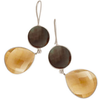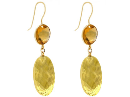In dekorativer und natürlicher Optik designte Ohrhaken aus vergoldetem 925 Sterling Silber mit je einem rund gefassten sowie facettierten Citrin und je einem Citrin in ovalem Facettenschliff. Maße: Länge ca. 6 cm, Citrin oval ca. 3 cm, Citrin rund ca. 1,6 cm.