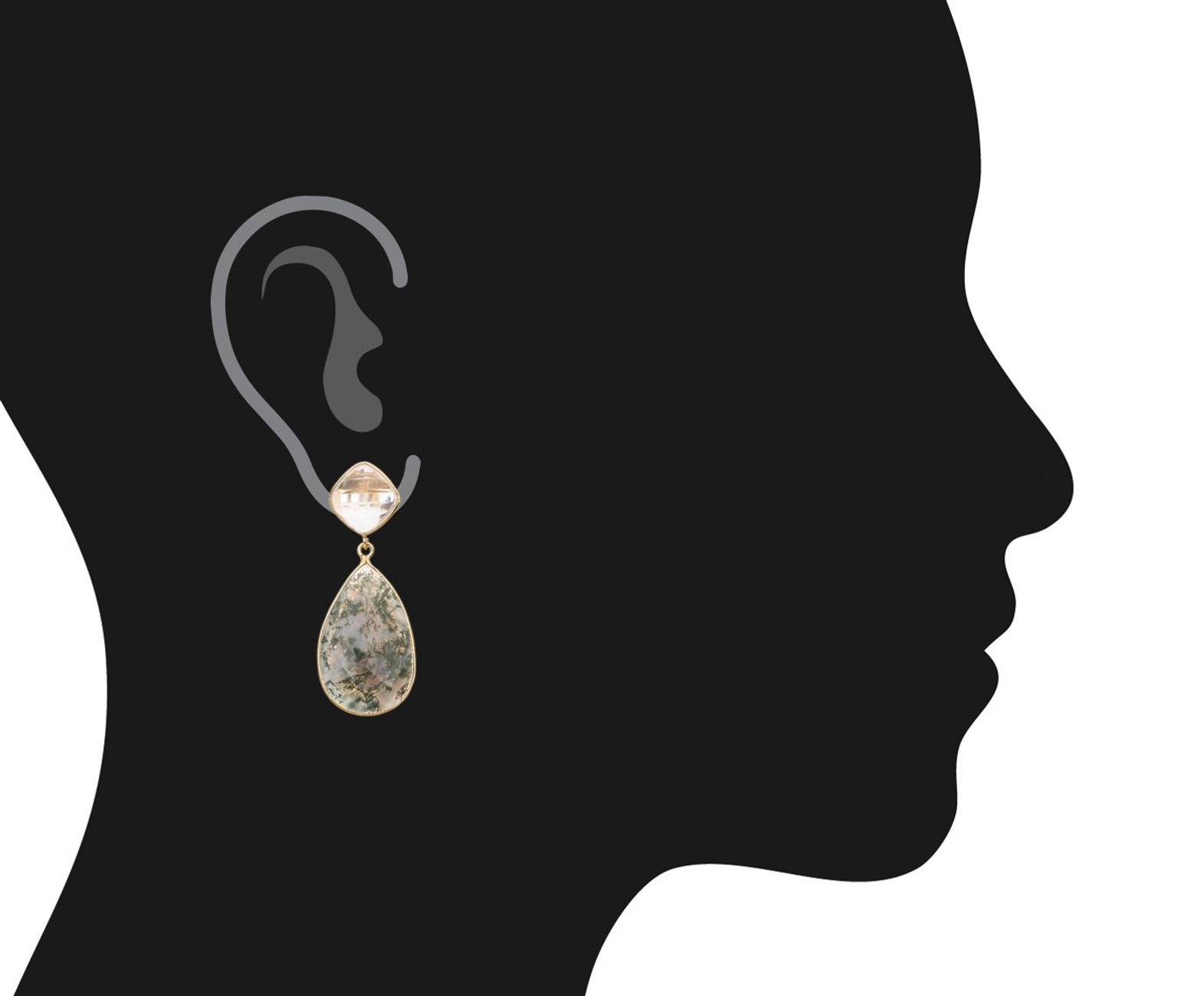 Exklusive Eleganz in Natur-Optik sind diese Ohrstecker aus vergoldetem 925 Sterling Silber mit je einem gefassten Bergkristall und je einem Tropfen gefassten Labradorit. Die Edelsteine sind facettiert. Maße: Länge ca. 4 cm, Breite ca. 2 cm.