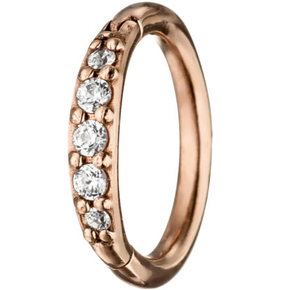 Edles Piercing/Segmentring aus Edelstahl mit rotgoldfarbener PVD-Beschichtung sowie weißen Swarovski-Elements. Der Segmentring verfügt über Klick-System und Scharnier. Maße: Außendurchmesser ca. 10,6 mm, Außendurchmesser ca. 8 mm, Breite ca. 1,8 mm, Ringstärke ca. 1,2 mm, Gewicht ca. 0,3 g * Bitte beachten Sie die Maße! Auf dem Foto kann der Artikel größer wirken*.