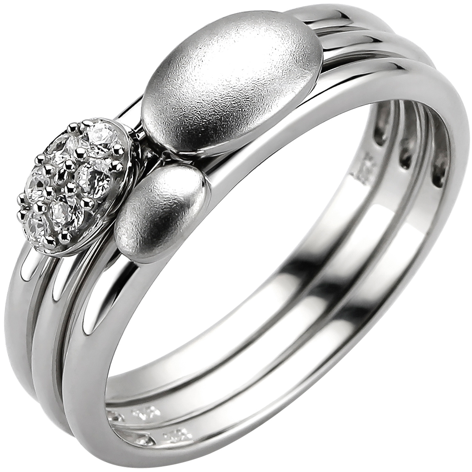 Elegant im Kreativ-Design gefertigter Drei-Bahnen-Ring aus rhodiniertem 925 Sterling Silber, teilmattiert und mit sechs facettierten Zirkonia in weiß besetzt. Maße: Breite ca. 6,3 mm, Tiefe ca. 4,2 mm, Gewicht ca. 3,5 g * Der Artikel ist anlaufgeschützt (rhodiniert) * Bitte beachten Sie die Maße! Auf dem Foto kann der Artikel größer wirken*.