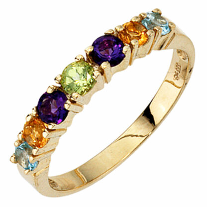 Ein zauberhafter Schmuck ist dieser Ring aus 8k (333) Gelbgold mit einzeln gefassten Farbedelsteinen. An den Ring gefasst sind zwei facettierte Blautopase (beh.), zwei facettierte Citrine, zwei facettierte Amethyste in violett und ein facettierter Peridot. Maße: Gewicht ca. 2,0 g, Breite ca. 3,4 mm, Tiefe ca. 3,8 mm.
