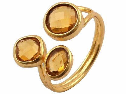 Stilvoll designter Ring aus vergoldetem 925 Sterling Silber mit drei gefassten sowie facettierten Citrinen. Der Ring ist größenverstellbar. Maße: ca. 5 mm, 6 mm und 8 mm.